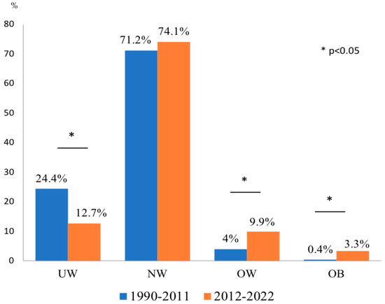 BMI status at CD diagnosis in 1990–2011 vs. 2012–2022. UW: underweight, NW: normal weight, OW: overweight; OB: obesity.