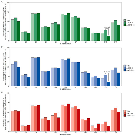Figure 1A–C illustrates the proportion of “yes” responses for each item in the total sample and across different age groups (5–9 years and 10–12 years) by sex, respectively. Q10 (“I eat more than two yogurts or two slices of cheese a day”) showed a higher percentage of “yes” responses in the 5–9-year-old group than in the 10–12-year-old group, particularly among total and males. Figure S1 shows the proportion of “yes” responses for each KIDMED item across different age groups. Figures S2 and S3 show the proportion of “yes” responses for each item across different BMI categories.