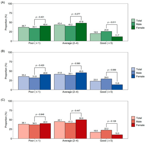 The proportion of “yes” responses for each item across different age groups. (A) total, (B) male, and (C) female.