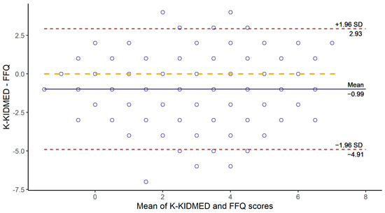 The agreement between total K-KIDMED and FFQ scores was analyzed using a Bland–Altman plot (Figure 3).