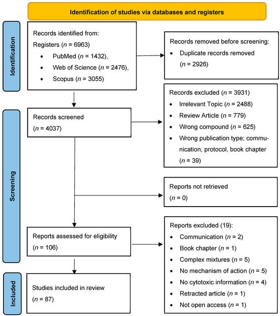 The database search revealed 6963 records for initial review, comprising 1432 from PubMed, 3055 from Scopus, and 2476 from Web of Science. Following the elimination of duplicates (n = 2924), there were 4039 articles screened based on titles and abstracts. After the exclusion of irrelevant articles (i.e., not related to the chemopreventive effects of O. europaea secoiridoids, n = 3929), a total of 110 articles were selected for a comprehensive full-text review. Ultimately, 88 articles met the previously established inclusion criteria (Figure 2).