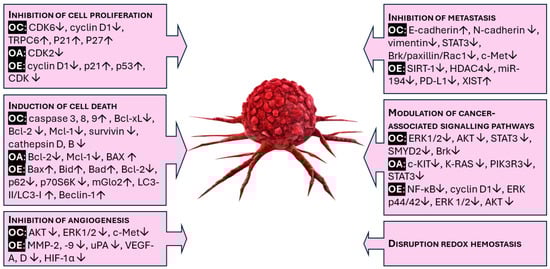 Oleacein in melanoma cells reduces the mRNA expression of c-KIT, K-RAS, and PIK3R3, which are crucial effectors responsible for heightened mTOR activation. When hyperactivated, mTOR signalling facilitates cell proliferation and metabolism, which contribute to both tumor initiation and progression [144]. Interestingly, oleacein counters the expression of these genes by inducing an increase in the expression of miR-34a-5p, miR-193a-3p, miR-193a-5p, miR-16-5p, and miR-155-5p [110]. These microRNAs serve as regulatory elements capable of decreasing the transcriptional levels of the target genes (c-KIT, K-RAS, and PIK3R3) [145,146,147]. In endothelial cells, oleacein hampers the PI3K/AKT and ERK/MAPK signalling pathways, which may contribute to its antiangiogenic effect [109]. In neuroblastoma cells, oleacein decreases the phosphorylation of STAT3, which may be associated with the observed increasing expression level of Bax and P53 genes as well as the decrease in Bcl-2, ultimately leading to apoptosis induction in these cells [111].