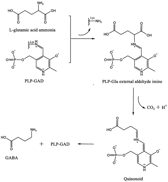 GAD is an enzyme that relies on pyridoxal phosphate (PLP) as an essential cofactor. PLP serves as a cofactor for numerous enzymes involved in transamination, decarboxylation, racemization, aldol cleavage, and other reactions [51,52]. In the absence of a substrate, the 4-formyl group of PLP interacts with a conserved lysine residue in the active site of GAD, forming a covalent bond to create an internal methylene structure known as an aldimine or Schiff base. When the substrate L-glutamic acid enters the active site of GAD, PLP forms an external aldehyde imine structure with the substrate. The conjugated system in this structure extends from the pyridine nitrogen to the α-carbon of glutamic acid. The nitrogen atoms in the pyridine ring and Schiff base exhibit strong electrophilic properties, which are further enhanced in their protonated state. As a result, the electron density around the α-carbon decreases, leading to a decrease in bond energy on the α-carbon. This, in turn, facilitates the catalytic decarboxylation reaction by GAD, forming a quinone intermediate. The conjugated system formed by the Schiff base and pyridine ring helps stabilize these quinone intermediates. Subsequently, protonation and transaldimination of the lysine residue in the active site lead to the regeneration of the aldimine within PLP-GAD and the release of the product, γ-aminobutyric acid (GABA) (Figure 1) [53,54].
