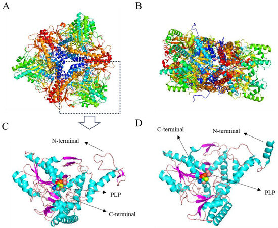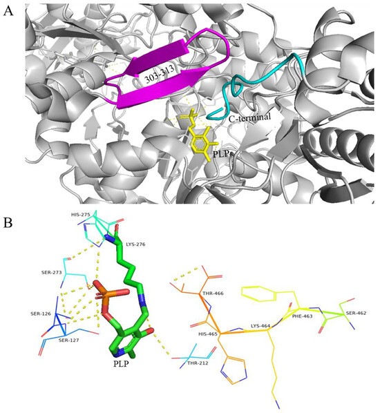 At a neutral pH, residues 452–466 at the C-terminal region adopt a well-defined crystalline structure that extends towards the interior of the active funnel, reaching the substrate binding site. Simultaneously, the β-hairpin conformation formed by residues 300–313 interacts with the C-terminal residue of another subunit in the dimer, creating steric hindrance and preventing the active center from binding to the substrate (Figure 3A) [57]. The interaction between PLP and neighboring amino acid residues plays a crucial role in supporting the catalytic activity of PLP cofactors. These amino acid residues assist in stabilizing the phosphate and pyridine rings of PLP cofactors, confining them to the active sites (Figure 3B) [58].