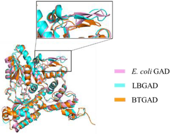 The gadB gene of Bacteroides thetaiotaomicron (BTGAD) encodes a protein consisting of 481 amino acids with a molecular weight of approximately 54.854 kDa. BTGAD exhibits low homology with GAD sequences from other sources, with a consistency of 42.5% to the GAD sequence of E. coli and 39.6% to the LBGAD sequence. However, their monomer structures are similar. The BTGAD monomer is also composed of three structural domains: N-terminal (residue 1–51), PLP binding domain (residue 52–359), and C-terminal (residue 360–481). The pH-dependent conformational changes of N-terminal residues 1–24 and C-terminal residues 465–481 in BTGAD are consistent with E. coli GAD [57]. The cofactor PLP forms a Schiff base with Lys274 in BTGAD and forms hydrogen bonds and hydrophobic interactions with surrounding residues to stabilize the active center. The corresponding β-hairpin in BTGAD is positioned closer to the substrate binding site compared to other GADs (Figure 4), resulting in more pronounced conformational changes. Additionally, BTGAD exhibits significant pH-dependent oligomeric changes. Studies have demonstrated that GAD exhibits different oligomeric states and absorbance spectra at different pH levels. At pH 4.4, BTGAD exists as hexamers, while at pH 5.8 and 7.0, it exists as a mixture of hexamers and dimers. As the pH increases, the proportion of hexamers decreases, while the proportion of dimers increases. At pH 8.0, BTGAD exists solely as dimers. Hexamers represent the active form of BTGAD, with BTGAD activity nearly absent above pH 5.6 [32].