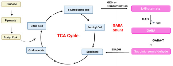 Due to the presence of GAD and PLP cofactors, GABA can be synthesized through irreversible decarboxylation reactions in various microorganisms, including bacteria, yeast, and fungi. The mechanism of GABA production in bacteria is illustrated in Figure 6. Microorganisms have the ability to produce GABA by directly utilizing L-glutamic acid as a substrate. Alternatively, glucose can be converted to pyruvate through glycolysis, which is then transformed to acetyl-CoA and enters the TCA cycle to produce α-Ketoglutaric acid. α-Ketoglutarate is catalyzed by glutamate dehydrogenase (GDH) to form L-glutamic acid, which is subsequently decarboxylated by GAD to generate GABA. Additionally, microorganisms possess a pathway to produce GABA by bypassing certain key steps in the TCA cycle. GABA within the mitochondrial matrix undergoes the action of GABA transaminase (GABA-T) to produce succinate semialdehyde (SSA), which is further oxidized by succinic acid semialdehyde dehydrogenase (SSADH) to succinic acid, ultimately resulting in the production of α-Ketoglutaric acid [82]. While SSADH is not directly involved in GABA biosynthesis, it catalyzes the first step in the degradation of GABA, and its enzymatic activity is essential for preserving intracellular GABA balance. Succinate serves as an electron donor in the mitochondrial electron transfer chain and plays a crucial role in the TCA cycle. GAD is present in the cytoplasm, while GABA-T and SSADH are located in the mitochondria [78]. The primary function of the GABA shunt is to generate GABA. However, the precursor molecules α-Ketoglutaric acid and succinic acid, which are intermediate products of the TCA cycle, also play a vital role in cell growth. This creates a competition between cell growth and the production of target chemicals, such as GABA. If the metabolic process is excessively biased towards GABA production, it can result in a decrease in bacterial cells, leading to inefficient fermentation. To achieve efficient fermentation and optimal GABA production, it is necessary to establish a suitable metabolic regulatory network that addresses the trade-off between cell growth and GABA production.