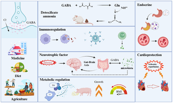 GABA, a naturally occurring non-protein functional amino acid, serves as a vital inhibitory neurotransmitter within the central nervous system of mammals, exerting regulatory influence over various bodily functions [97]. As research progresses, the physiological role of GABA has become increasingly elucidated, evolving into a novel functional factor extensively employed in medicine, food healthcare, and agricultural industries (Figure 7).