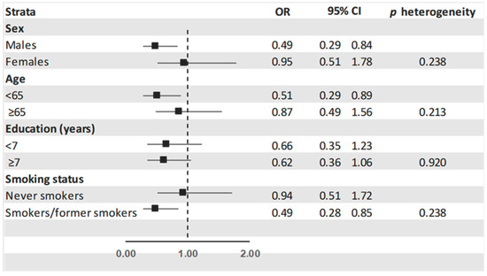 Odds ratios a (OR) of gastric cancer and corresponding 95% confidence intervals (C) for the highest versus the lowest tertile of isoflavone intake in the strata of selected characteristics. Italy 1997–2007. a Derived from the logistic regression model adjusting for sex, age, education, year of interview, smoking status, and total energy intake.