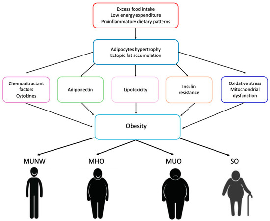 Based on available evidence, different phenotypes of obesity have been described including metabolic unhealthy normal weight (MUNW), metabolically healthy overweight/obese (MHO), metabolically unhealthy overweight/obese (MUO), and sarcopenic obesity (SO) [60] (Figure 1).