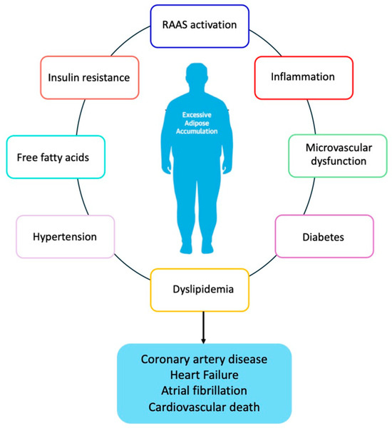 A large body of evidence has demonstrated the association between obesity and CVD, including atherosclerotic events and heart failure (HF) and indeed, the secretion of growth factors, cytokines, and vasoactive peptides by VAT, neurohormonal dysfunction, insulin resistance and hyperinsulinemia, the activation of the renin–angiotensin system (RAAS) and inflammation induced cardiac fibrosis, cellular death, and microvascular dysfunction [3,43,44]. These conditions are associated with hypertension and other features of metabolic syndrome as well as coronary heart disease and heart failure development (Figure 2).