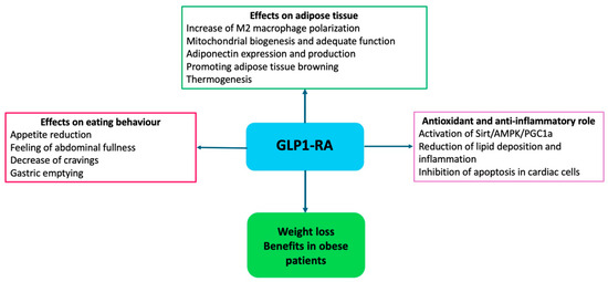 More recently, GLP1-RA has shown significant results independently from diabetes, stimulating insulin secretion and glucose-lowering, slowing gastric emptying, and increasing hypothalamic sense of satiety through stimulating POMC neurons [104,105] (Figure 3).