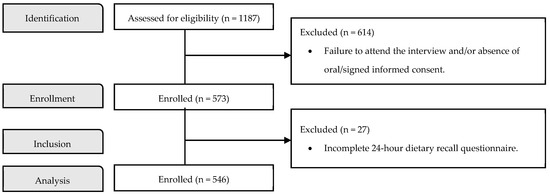 The inclusion criterion was to be a 5th or 6th grader at one of the 8 public basic education schools covered by the project. Exclusion criteria were non-attendance at the interview and/or the absence of data essential to the research, particularly on dietary intake. The sample size was calculated by the National Statistics Institute (INE) of STP, using a cluster and convenience sampling method, thus guaranteeing the estimated numbers in each school in Cantagalo. Further analysis confirmed that there were no differences regarding food insecurity (FI) when comparing excluded participants to those included with complete dietary data, suggesting that our findings were not biased by the exclusion criteria. Accordingly, out of the total of 1187 eligible students, 573 attended the interview and were enrolled in this study. In the end, only 546 were analyzed, as they met all the criteria. Figure 1 presents the study flow.