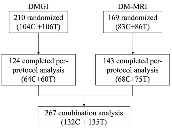 Both trials included men or postmenopausal women living with T2DM (HbA1c ≥ 6.5 to ≤8.0%) taking oral antihyperglycemic agents at a stable dose for ≥2 (DM-MRI) or ≥3 months (DMGI). Figure 1 presents the participant flow from both trials. Dietary and HbA1c data were available at baseline and 6 months in a total of 267 participants.