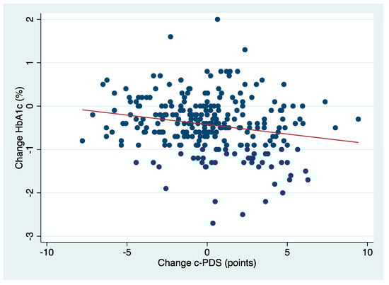 Strengths of the present study include, for one, the use of the c-PDS to predict concomitant changes in HbA1c as a measure of glycemic control in adults living with T2DM. HbA1c has been extensively studied as a strong indicator of T2DM incidence risk and provides a clinical measure of long-term (2–3 months) glycemic control []. In patients living with T2DM but without a history of CVD, when HbA1c is poorly controlled (8–8.9%) their risk of CVD mortality increases compared to that of patients with established CVD []. Another strength was the use of multiple linear regression analysis, which allows for possible confounders to be accounted for and for predictions about health outcomes to be made. Furthermore, analyses were performed in a population of adults living with T2DM, strengthening confidence in the estimated benefit for T2DM management.