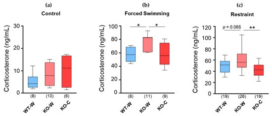 Immunoreactivity of plasma corticosterone was analyzed using a corticosterone ELISA kit (Cayman Chemical, Ann Arbor, MI USA), following the manufacturer’s instructions. The plasma samples (5 μL) were thawed and diluted to 1:80 in assay buffer. Fifty microliters of the sample was used for the assay. Blood samples were assayed without protein extraction, as previously described []. The assay had two linear ranges covering a concentration range of 30–1000 pg/mL. The inter- and intra-assay coefficients of variation were <5%.