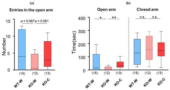Elevated plus maze test. (a) Numbers of entries in the open arms. (b) Time in the open arm or the closed arm. Numbers of animals are shown in bars. Bars are represented in median and interquartile ranges in each group. * p ≤ 0.05. ** p ≤ 0.01. n.s.: not significant.
