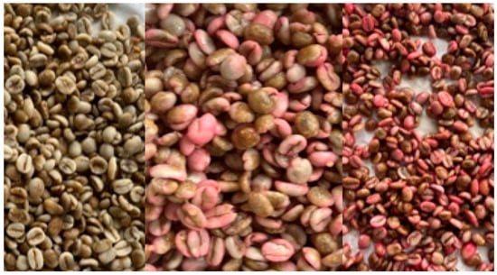Ripe, undamaged fruits were selected for analysis. The ripeness of the fruit was assessed organoleptically, by color and aroma. The amount of fruit to be macerated and the maceration time were selected experimentally, based on a preliminary study in which color and taste were assessed after various maceration times. Fresh apples, quince, melon, strawberry, raspberry, cherry, and grapefruit were washed and cut; 100 g of fruit, crushed using a kitchen grater and a mixer, was mixed with 100 g of green coffee beans. Coffee beans with fruit pulp were closed in a jar and placed in the refrigerator (4 °C) for 24 h. All variants were thoroughly mixed and placed in the refrigerator for a specified amount of time to carry out the maceration process. Then, the coffee beans were separated from the fruit under running water and dried for one day at a temperature of 50 °C to achieve 95% of solids. Next, 100 g of macerated green coffee was roasted at 230 °C for 12 min until the coffee beans were dark in color. The coffee beans were air-cooled. Figure 1 shows examples of coffee beans after maceration and drying.