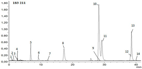 Hydroxycinnamic, phenolic, and organic acids; caffeine; HMF; and acrylamide were determined in extracts. The analysis was carried out according to the method developed in the previous work [40]. In short: The mobile phase consisted of solvent A—water/formic acid (99.9:0.1, v/v); solvent B—acetonitrile/formic acid (99.9:0.1, v/v). A flow rate of 0.2 mL/min and injection volume of 2 μL was used. The calibration curves were constructed for a standard compound using six different concentration levels in a range of 0.01–1.0 mg/mL. Instrument control, data acquisition, and evaluation were carried out with LabSolutions 5.60 SP2, Chromatography Data System, and Postrun Analysis (LabSolutions 5.60 SP2) software, respectively. The mass spectrometric conditions were as follows: capillary voltage of 4500 V, drying gas temperature of 250 °C, drying gas flow of 15 L/min, and nebulizing gas pressure of 1 bar; the capillary temperature was 350 °C, and nitrogen was used as nebulizer. Full-scan mass spectra were acquired over a mass range from m/z 50 to 2000 in negative ion mode [40]. Figure 2 shows example HPLC chromatogram.