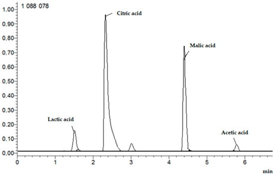 Example HPLC chromatogram of organic acids: lactic, citric, malic, and acetic.