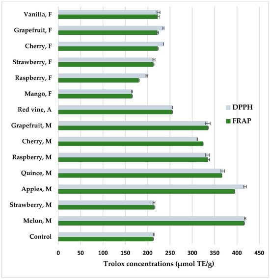 Figure 4 shows antioxidant properties of coffee extracts prepared from coffee beans after maceration determined by DPPH and FRAP methods. Both methods showed a high positive correlation of the results, amounting to r = 0.98. Coffee methanolic extracts form the beans that had been pretreated by maceration with fruit pulps before roasting had increased antioxidant potential compared to the control (p < 0.05). Fruits such as melon (FRAP—416.77 μmol TE/g; DPPH—418.33 μmol TE/g), apple (FRAP—395.02 μmol TE/g; DPPH—418.22 μmol TE/g), and quince (FRAP—366.15 μmol TE/g; DPPH—368.12 μmol TE/g) showed the highest potential to increase the antioxidant activity in coffee. However, maceration in wine or the addition of food flavors such as cherry, strawberry, grapefruit, and vanilla resulted in similar antioxidant properties to the control coffee extract. In turn, mango and raspberry aroma reduced antioxidant properties. Melon has a high antioxidant potential because it is a source of vitamin C and A, β-carotene, and phytoene, with a total polyphenol content of 40–80 mg/100 g [80]. Maceration with the participation of hydrolytic enzymes releases sugars, amino acids, and polyphenols, which undergo non-enzymatic browning during roasting, so macerated coffees darken faster and show higher antioxidant activity after roasting. In addition to producing dark dyes, coffee fermentation contributes to enriching the aroma with a number of desirable compounds from the pyrazine, alcohol, aldehyde, ketone, phenol, furan, pyrrole, and other groups [81,82,83]. In fermented coffees, the content of organic acids such as malic and lactic increases, which give the infusions a pleasant acidity [84]. Maceration in strawberry pulp showed low antioxidant potential, which is related to the low content of chlorogenic acids. A better maceration effect could have been achieved with seasonal strawberries.