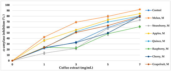 α-Amylase is the main enzyme responsible for the decomposition of α-glucans by hydrolytic catalysis, making them bioavailable and potentially bioabsorbable. The use of α-amylase inhibitors is an essential element in the prevention of diabetes [43]. Coffee extracts subjected to various aromatization methods showed properties of over 50% inhibition of the enzyme (Table 5, Figure 5 and Figure 6). The inhibitory activity almost linearly increased with increasing concentrations of coffee extract in the tested range. The method of coffee bean maceration with fruit pulps of melon (92.11%, IC50 = 3.80 mg/mL), apple (84.55%, IC50 = 4.14 mg/mL), and red wine (88.33% IC50 = 3.96 mg/mL) showed the highest enzyme inhibition activity (α-amylase 0.5 mg/mL, 10 μmol/mL). However, the aromatization method with the addition of aroma oils from mango and raspberry showed enzyme inhibition activity lower than in the control sample.
