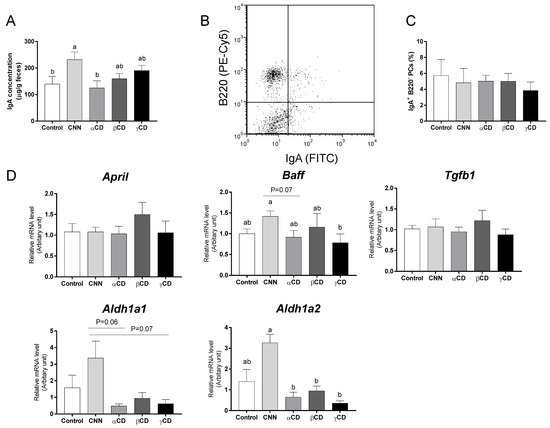 The fecal IgA concentration in the CNN group was significantly higher than those in the control and αCD groups (Figure 1A). There was no significant difference in the proportion of IgA-secreting PCs (IgA+ B220−) in the colonic LP (Figure 1B,C). Transcript levels of the genes encoding aldehyde dehydrogenase 1 family, member A1 (Aldh1a1), aldehyde dehydrogenase 1 family, member A2 (Aldh1a2), a proliferation-inducing ligand (April), B-cell-activating factor (Baff), and transforming growth factor beta 1 (Tgfb1) in the colon are shown in Figure 1D. There was no significant difference in the transcript levels of April and Tgfb1 among the groups. The CNN group exhibited a significant accumulation of Baff mRNA compared to the γCD group. The levels of Aldh1a1 transcript in the CNN group were nominally (but not significantly) higher than those in the αCD and γCD groups (p = 0.06 and p = 0.07, respectively). The levels of Aldh1a2 transcript in the CNN group were significantly higher than those in the αCD, βCD, and γCD groups, and nominally (but not significantly) higher than those in the control group (p = 0.07).