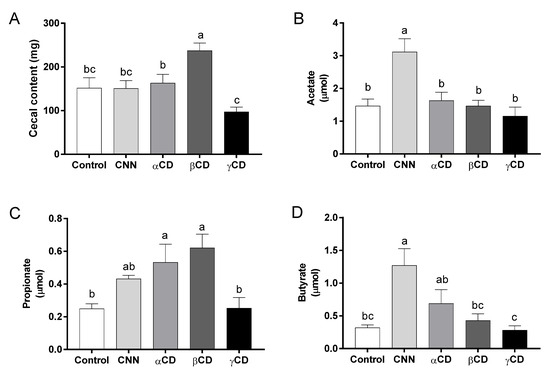 The cecal content weight and the acetate, propionate, and butyrate concentrations in the cecal content are shown in Figure 2. The cecal content weight was significantly higher in the βCD group than in the other groups (Figure 2A). The acetate concentration was significantly higher in the CNN group than in the other groups (Figure 2B). The propionate concentrations were significantly higher in the αCD and βCD groups than in the control and γCD groups (Figure 2C). The butyrate concentration was significantly higher in the CNN group than in the control, βCD, and γCD groups (Figure 2D).