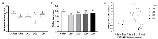 Analysis of alpha- and beta-diversity. Alpha-diversity analysis included (A) Shannon diversity and (B) Pielou’s evenness indices of the bacterial community. (C) Beta-diversity analysis using principal coordinate analysis based on unweighted UniFrac distance. Data are presented as median (interquartile range) (n = 6). The Shapiro–Wilk test was applied to test for normality. For data that failed the normality test, differences among groups were evaluated using the two-tailed Kruskal–Wallis test. For data that passed the normality test, equality of variance was tested using Bartlett’s test. Based on the results of Bartlett’s test, differences among groups were evaluated using two-tailed one-way ANOVA (equal variances) or Kruskal–Wallis test (unequal variances), and then by post hoc multiple comparisons tests, as needed. Values without a shared letter exhibited statistically significant differences (p < 0.05). Abbreviations: CNN: cyclic nigerosyl-1,6-nigerose; CD: cyclodextrin.