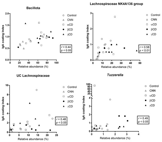 Correlation between the relative abundance (RA) of total bacteria and the immunoglobulin A (IgA) coating index (ICI). The Shapiro–Wilk test was applied to test for normality. For data that passed the normality test, correlations were assessed using Pearson’s correlation test. For data that failed the normality test, correlations were assessed using Spearman’s correlation test. The phyla and genera that exhibited significant correlations are shown. Abbreviations: CNN: cyclic nigerosyl-1,6-nigerose; CD: cyclodextrin.