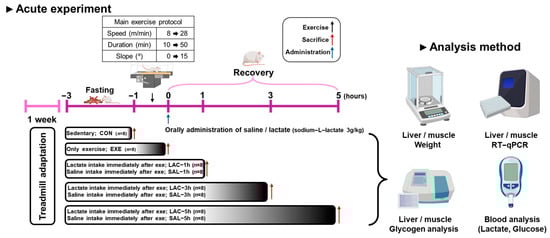 The experiment was designed to determine the effect of an acute (one-time) treatment of exogenous lactate. The mice were randomly divided into eight groups (Figure 1): sedentary group without any treatment (CON; n = 8), exercise-only group (EXE; n = 8), and lactate- and saline-treated group with oral administration of lactate and saline, respectively, immediately after exercise (LAC; n = 24; SAL; n= 24), which were further subdivided by 1, 3, and 5 h time points (LAC-1, LAC-3, LAC-5; SAL-1, SAL-3, SAL-5; n = 8 mice/group). All mice were acclimated to the laboratory environment for one week. Exercise adaptation training was conducted on an animal treadmill for 3 days. The exercise intensity in this experiment was set at VO2max80% to deplete glycogen in the skeletal muscles and liver. A detailed exercise protocol is provided in the following paragraphs. And lactate and saline water were orally administered to the LAC and SAL groups, respectively, immediately after the treadmill exercise at 3 g/kg (sodium L-lactate, L7022, Sigma) [26,27,28,29]. The mice were then sacrificed at the resting times (1, 3, and 5 h) determined for each group.