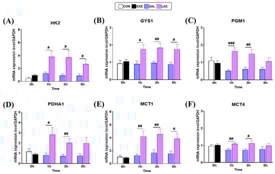 We next examined the expression of core enzymes, Hexokinase2 (HK2), Glycogen synthase1 (GYS1), and Phosphoglucomautase1 (PGM1), involved in glycogen synthesis in the skeletal muscle using qRT-PCR to elucidate the molecular mechanism of exogenous lactate treatment on glycogen recovery after exercise (Figure 5). No significant differences in the gene expression levels of HK2, GYS1, and PGM1 were observed between the CON and EXE groups. However, HK2 gene expression was significantly higher in the LAC group than in the SAL group at 1 h (p = 0.012), 3 h (p = 0.024), and 5 h (p = 0.019) post-exercise (Figure 5A). Similarly, GYS1 gene expression was significantly higher in the LAC group than in the SAL group at 1 h (p = 0.017), 3 h (p = 0.009), and 5 h (p = 0.015) post-exercise (Figure 5B). Moreover, the LAC group showed significantly higher PGM1 gene expression than the SAL group at 1 h (p < 0.001) and 3 h (p = 0.007) post-exercise (Figure 5C). Additionally, to confirm that exogenous lactate treatment was used as an energy source in muscle cells, we examined the expression of Pyruvate dehydrogenase E1 alpha 1 (PDHA1). Consistent with the results of glycogen synthesis enzymes, no significant difference in PDHA1 gene expression was observed between the CON and EXE groups. However, PDHA1 gene expression was significantly higher in the LAC group than in the SAL group at 1 h (p = 0.018) and 3 h (p = 0.01) after exercise. No significant difference (p = 0.06) in PDHA1 gene expression was observed between the LAC and SAL groups at 5 h after exercise (Figure 5D). Furthermore, we examined the expression of the lactate transporters, MCT1 and MCT4, to confirm lactate transportation in muscle cells. No significant difference in MCT1 and MCT4 gene expression levels was observed between the CON and EXE groups. However, MCT1 gene expression was significantly higher in the LAC group than in the SAL group at 1 h (p = 0.004), 3 h (p = 0.009), and 5 h (p = 0.023) after exercise (Figure 5E). Similarly, MCT4 gene expression was significantly higher in the LAC group than in the SAL group at 1 h (p = 0.004) and 3 h (p = 0.034) after expression. However, no significant difference (p = 0.328) in MCT4 gene expression was observed between the LAC and SAL groups at 5 h after exercise (Figure 5F). Overall, increased expression of MCT1, MCT4, and glycogen synthase was observed in the LAC group. The normality of the muscle qRT-PCR analysis data was assessed using the Shapiro–Wilk or Kolmogorov–Smirnov test. The results indicated that the data were normally distributed (p > 0.05). Therefore, parametric tests were applied in further analyses.