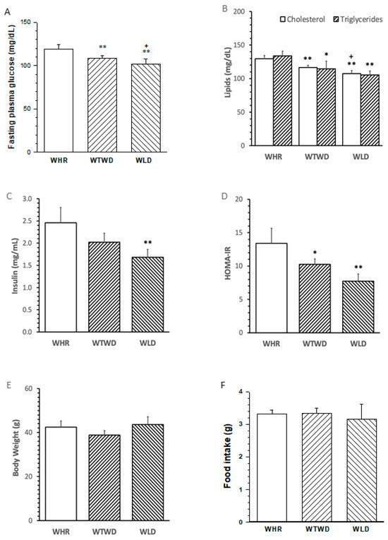 Influence of WLD and WHR on metabolism in HFD-fed mice. Male C57 BL/6 J mice were fed with HFD supplemented with 26 g wt% of WHR, 26 g wt% of WLD or 13 g wt% of WHR + 13 g wt% of WLD (WTWD) for 12 weeks. Blood samples were withdrawn via saphenous vein after an overnight fasting for the measurements of the levels of fast plasma glucose (FPG), total cholesterol, triglycerides and insulin. Body weights were measured on the day before tissue harvesting. Food intake was assessed for the 24 h period during the last week of the experiment. (A): FPG. (B): total cholesterol and triglycerides. (C): insulin; (D): homeostatic model assessment-insulin resistance (HOMA-IR); (E): body weight. (F): daily food intake. The values were expressed in mean ± SD mg/dL (n = 5/group) or gram (g). *, **: p < 0.05 or 0.01 versus WHR group (ANAVA, Tukey test); +: p < 0.05 versus WTWD group.