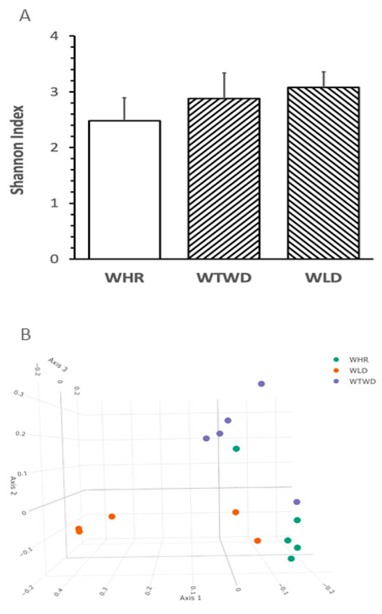 No significant difference in the levels of Shannon index, a common variable used for assessing richness and evenness of α-diversity in gut microbiota, was detected in feces from the three groups of mice receiving different dietary interventions (Figure 4A). The plot of principal component analysis demonstrated that the β-diversity in HFD + WLD diet-fed mice was well separated from that of HFD + WHR-fed mice and that in HFD + WTWD-fed mice partially overlapped with that of HFD + WHR-fed mice as expected (Figure 4B).