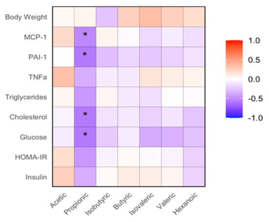Correlation between SCFAs and metabolic or inflammatory markers in mice receiving HFD supplemented with WLD or WHR. The regimen was identical to that of Figure 2. SCFA measurements were conducted as described in the Methods. *: p < 0.05 between SCFA and biochemical variable using linear regression analysis (n = 15).