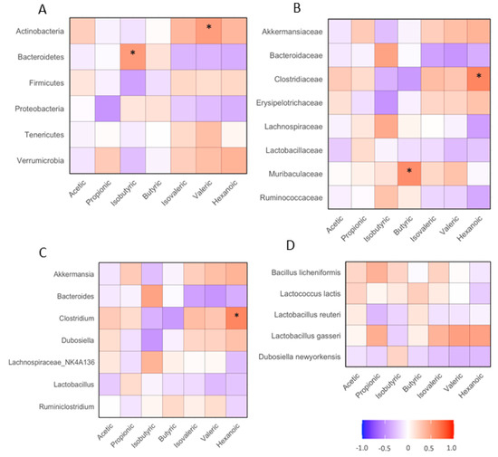 The abundance of fecal isobutyric acid positively correlated with Bacteroidetes phylum bacteria in the gut (p < 0.05). The abundance of fecal valeric acid positively correlated with fecal Actinobacteria phylum bacteria (p < 0.05, Figure 7A). The abundance of fecal butyric acid positively correlated with the fecal Muribaculaceae family of bacteria (p < 0.05). The abundance of fecal hexanoic acid positively correlated with the fecal Clostridiaceae family of bacteria (p < 0.05, Figure 7B). The abundance of fecal hexanoic acid positively correlated with the fecal Clostridum genus bacteria (p < 0.05, Figure 7C). The abundances of SCFAs did not significantly correlate with any type of species of bacteria in the mice (Figure 7D).