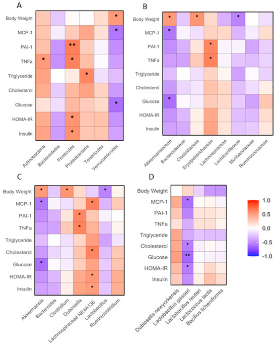 Correlation between gut microbiota and biochemical variables in HFD-fed mice. The regimen of dietary intervention and animal groups was the same as that in Figure 2. Bacterial gene sequencing, biochemical analysis and body weights were conducted as described in the Methods. (A): Correlation between phylum bacteria, biochemical variables or body weights; (B): correlation between family bacteria, biochemical variables or body weights; (C): correlation between genus bacteria, biochemical variables or body weights; (D): correlation between species bacteria, biochemical variables or body weights. *, **: p < 0.05 or 0.01 between gut bacteria and biochemical variable or body weight using linear regression analysis (n = 15).