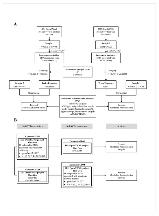 The GWAS summary statistics for 16,379,684 SNPs associated with GDM were obtained from the IEU OpenGWAS Project (https://gwas.mrcieu.ac.uk/, accessed on 4 February 2024). Our study focused on the FinnGen study data within this project, which provides the largest and most recent GWAS data for GDM (GWAS ID: finn-b-O15_PREG_DM). The dataset encompasses genetic information sourced from the FinnGen biobank, as well as related national health registry data derived from a total of 12,859 cases and 73,341 controls. The researchers at FinnGen employed a range of Illumina and Affymetrix GWAS chips to genotype the cohort of people. Genotype interpolation was performed using the Beagle v.4.1 program, employing a population-specific reference panel consisting of 3775 high-coverage whole genome sequences originating from Finland. In the reverse MR analysis, we selected SNPs associated with GDM. Following exclusions, our analysis included 26 SNPs for vitamin D deficiency and 10 SNPs for vitamin D levels as different outcomes (see the Supplementary Materials, Tables S3 and S4). These SNPs were used as genetic instruments to predict GDM from a genetic perspective. Based on the genome-wide threshold (p < 1 × 10−5), 41 SNPs associated with GDM were selected through LD-based pruning. After screening and removing SNPs using the PhenScannerV2 database, considering minor allele frequency, initial MR analysis leave-one-out results, culling palindromic sequences, and information loss during data extraction for vitamin D deficiency and vitamin D levels, 26 SNPs and 10 SNPs were finally included in the final MR analysis.