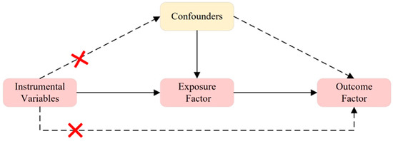 Three Assumptions of MR. Assumption 1: The instrumental variable is closely related to the exposure factor; Assumption 2: The instrumental variable is not influenced by known or unknown confounding factors; Assumption 3: The instrumental variable affects the outcome factor only through the exposure factor. A red cross indicates that exposure does not affect outcome in this pathway.