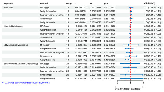 This study sought to examine the correlation between vitamin D levels and the occurrence of GDM, as well as to analyze the reverse causative relationship. The results indicate that higher vitamin D levels are associated with an increased probability of developing GDM, demonstrating a positive correlation. Conversely, vitamin D deficiency is negatively correlated with GDM. Potential confounding factors did not influence the process of inferring this causal relationship. Cochran’s Q and leave-one-out analysis identified no SNPs significantly impacting the results. Additionally, MR-Egger and MR-PRESSO tests did not detect any horizontal pleiotropy. Therefore, the sensitivity analysis and multiple comparisons correction confirm the reliability of these results.