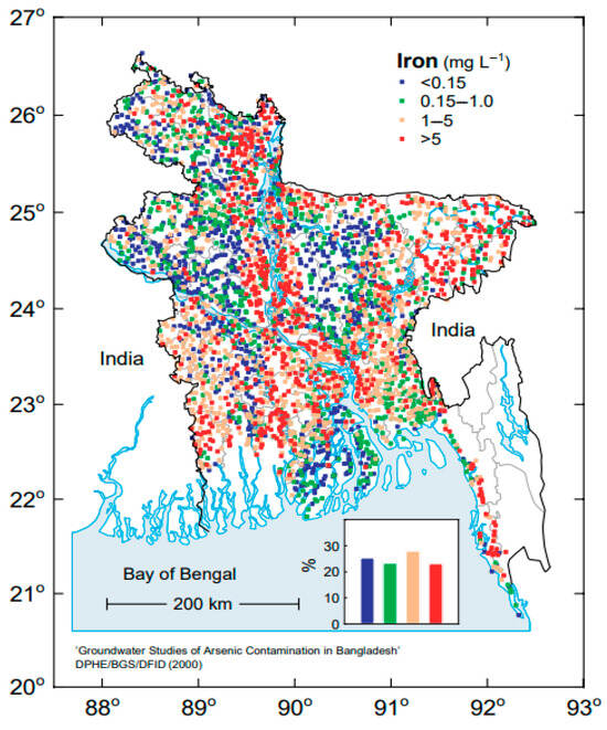 However, contrary to popular perception, the National Micronutrient Survey 2011–2012 reported that the prevalence of iron deficiency (ID) in children under five years old was 10.7%, and iron deficiency anemia (IDA) was 7.2% [7]. Recent studies attributed the low prevalence of ID and IDA in the Bangladesh population to drinking iron-containing groundwater from tube wells [2,8]. Of note, groundwater (extracted from hand-pumped tube wells) is the principal source of drinking water for the large majority (97%) of the rural population in Bangladesh [9]. The hydrochemistry of Bangladesh groundwater reveals that it contains varying concentrations of dissolved iron, with a predominantly high concentration in many parts of Bangladesh, but a largely low concentration in other parts (Figure 1) of the country [2,9]. Furthermore, a prominent feature of groundwater is that the iron concentrations vary considerably between tube wells located near each other. Hence, even in predominantly high-iron groundwater areas, some wells contain a low concentration of iron in the water.
