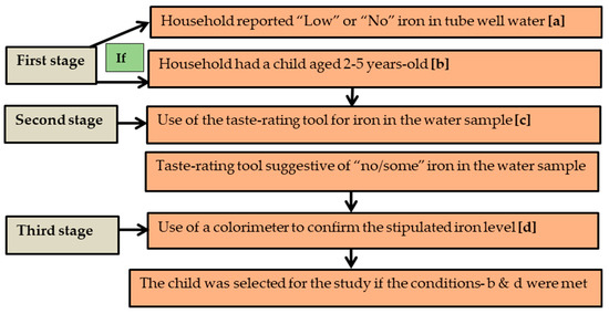 The study participants were children aged 2–5 years residing in Belkuchi—a rural subdistrict of north-west Bangladesh. The children were selected from a household if the groundwater iron concentration of the tube wells they drank from was low, i.e., 0–<2 mg/L. Low concentration (<2 mg/L) is defined as per the cut-off recommended by the joint technical committee of the Food and Agricultural Organization and World Health Organization FAO/WHO [11]. The sampling was conducted over three stages (Figure 2).