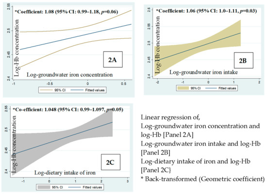 Figure 3 shows the linear regression of the log-hemoglobin concentrations in children vs. (2A) log-groundwater iron concentration, (2B) log-intake of groundwater iron, and (2C) log-dietary intake of iron. The geometric mean of iron concentration of groundwater and the concentration of the children’s hemoglobin was positively associated at a 6% level of statistical significance; (coefficient: 1.08; p = 0.06, 2A). The geometric mean of the intake of groundwater iron and dietary iron vs. the hemoglobin concentrations were statistically significant (coefficient: 1.06, p = 0.03, 2B) and just significant (coefficient: 1.048, p = 0.05, 2C), respectively.