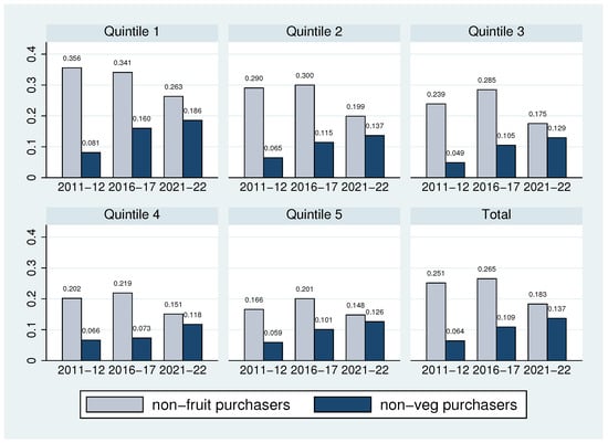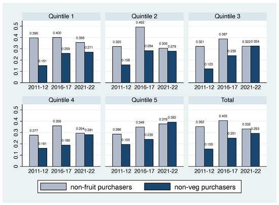 Non-purchasers by household income quintiles—Overall. The data presented in the figures use statistical survey weights. The figure uses the full sample. The non-fruit purchase column, presented in light blue, corresponds to the percentage of the population that does not purchase fruits. In a similar way, the non-vegetable purchase column is presented in dark blue.