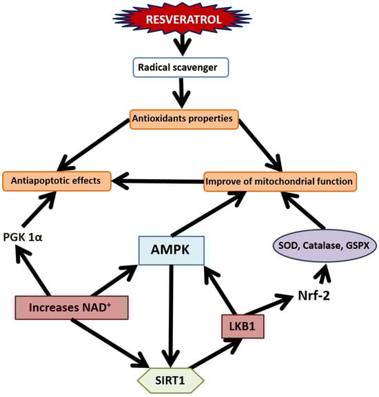 Neuroprotective effects of RES are strongly associated with improved mitochondrial function. RES enhances mitochondrial function via the activation of the SIRT1/AMPK/ PGC-1 pathway []. Specifically, RES targets SIRT1, which in turn upregulates AMPK through LKB1. AMPK promotes the protective effects of PGC-1 on mitochondria, mediating the antiapoptotic effects of RES. Independent of PGC-1, RES’s antiapoptotic effects may also be facilitated via Nrf-2, a key antioxidant transcriptional factor, resulting in increased transcription of antioxidant enzymes such as superoxide dismutase, catalase, and glutathione peroxidase (GSPX) [,]. Additionally, RES acts as a free radical scavenger, as it easily enters mitochondria, further contributing to its antioxidant effects (Figure 2) [].