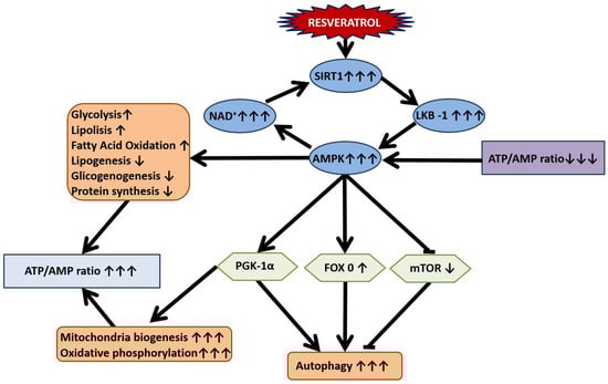 Resveratrol impact on metabolism via SIRT1/AMPK/PGK1- pathway, indicated by upregulation (upward arrows) or downregulation (downward arrows).