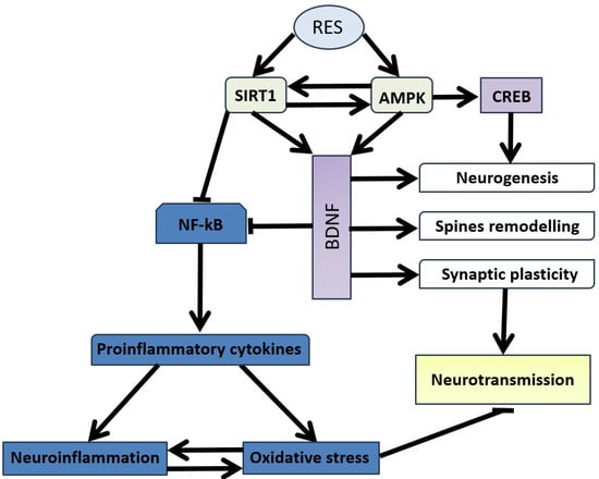 Overall, SIRT1 and AMPK occupy upstream positions in signaling cascades that mediate RES neuroprotective potential, while enzymes such as extracellular signal-regulated kinase 1/2 (ERK1/2), monoamine oxidase (MAO), and transcription factors and neurotrophins such as BDNF, CREB, Nrf-2, mammalian target of rapamycin (mTOR), Forkhead box O (FOXO), NF-B, and others are downstream targets [].