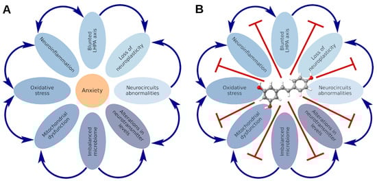 (Figure 5A) illustrates the key components of the pathogenesis of stress-related anxiety disorders, including neuroinflammation, oxidative stress, mitochondrial dysfunction, reduced neuroplasticity, abnormalities in neuronal circuits and neurotransmitter levels, aberrations in cerebral blood flow, impaired LHPA axis function, and abnormalities in the gut–brain and liver–brain axes. (Figure 5B) demonstrates the ability of resveratrol to correct each of these pathogenic factors, supporting its consideration as a therapy based on pathogenesis. The subsequent discussion highlights the role of the aforementioned factors in the development of anxiety and the significance of resveratrol in their correction.