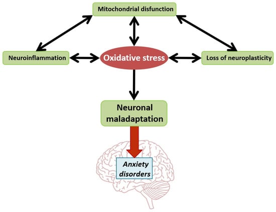 Recent studies have identified multiple brain areas involved in stress and anxiety responses, including the hypothalamus, amygdala, prefrontal cortex, ventral tegmental area (VTA)–nucleus accumbens (NAc) pathways of the mesolimbic system, locus coeruleus, and raphe nucleus. Persistent anxiety-like behavior is associated with neuroinflammation, oxidative stress, and reduced neuroplasticity, which are closely interconnected [,,,,,,].