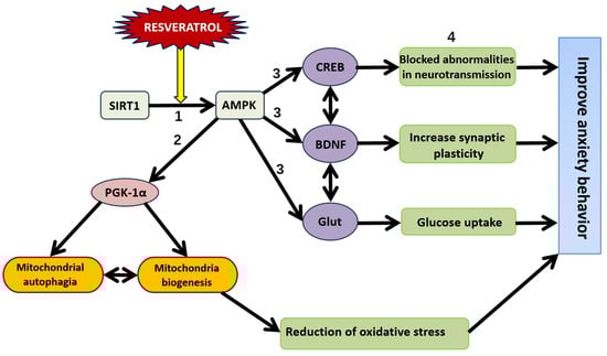 RES exhibits neuroprotective properties, primarily regulating stress-related anxiety behavior. Its neuroprotective potential lies in its ability to target multiple signaling pathways involving AMP-activated protein kinase (AMPK), neurotrophins such as brain-derived neurotrophic factor (BDNF), transcription factors such as cAMP response element-binding protein (CREB), nuclear factor kappa-light-chain-enhancer of activated B cells (NF-B), nuclear factor erythroid 2-related factor 2 (Nrf-2), and others. Notably, many of these targets are activated through sirtuin 1 (SIRT1) []. Sirtuins, nicotinamide adenine dinucleotide (NAD)-dependent deacetylases, are involved in stress responses and are considered longevity genes, with SIRT1 being the main intracellular target of RES []. SIRT1 regulates histone deacetylase (HDAC) activity, modulating the expression of multiple genes []. The neuroprotective potential of RES may improve anxiety behavior by correcting the pathogenesis of stress-related anxiety disorders. RES has been shown to ameliorate anxious behavior by correcting oxidative stress, mitochondrial dysfunction, and neuroinflammation; improving neuroplasticity; and restoring neurotransmitter balance in various brain areas [].