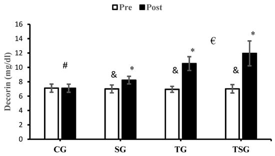 The mean ± standard deviation (SD) values of decorin before and after the training. * shows significant differences with the control group (p < 0.05). # depicts significant interaction between time and group (p < 0.05). € discloses significant interaction between time and group (p < 0.05). Control (CG), supplement (SG), training (TG), and training+ supplement (TSG) groups. & indicates significant differences with the pretest values (p < 0.05).